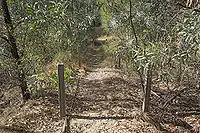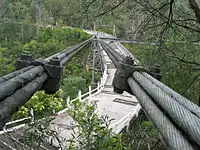 Maldon was also the site of 'Harvey's Crossing', one of two stone causeways over the Upper Nepean River on the Picton - Menangle Road. Stonework supporting the steep approach roads on each side can still be seen. The causeway was replaced by a wooden suspension bridge in 1903, designed by Ernest Macartney de Burgh.[3] By the 1970s, the bridge had become a severe bottleneck, especially with the increasing coal traffic. A deviation of the main road and a concrete beam bridge were constructed further north along the Gorge, and opened in 1980.[4] The Suspension Bridge is now a Heritage item.[5] It is closed to all traffic, including pedestrian.