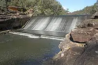 The Maldon Weir (34°12′12.27″S 150°37′47.01″E) lies about 250 metres upstream from the Suspension Bridge. It formerly supplied water to the nearby Stonequarry Lodge Hostel.[7] Maldon Weir is currently (August 2010) the only weir on the Upper Nepean River not targeted for modification, despite having been identified as a major barrier to fish migration.[8] Most other Upper Nepean weirs will be given increased capacity, to improve environmental flows, and improved fishways will be installed, as part of Sydney Catchment Authority's Weirs Project.[9]