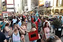 Areas affected by the outage included Times Square, Rockefeller Center, Radio City Music Hall, and Broadway theatres.[1][4][8] Most theaters on Broadway cancelled their shows for the evening; of the 30 shows running at the time, only the four playing on the east side of Broadway were able to perform.[10] Performances at Carnegie Hall and Lincoln Center were also cancelled. However, some performers from the canceled shows entertained audiences on the sidewalks outside the theaters. The blackout also canceled a Jennifer Lopez concert at Madison Square Garden.[1][10]