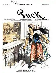 Not all editors were convinced of the mob's innocence. The Charleston News and Courier argued that murder by vigilantes was no more acceptable than any other kind. The St. Louis Republic wrote that the men were killed "on proof of being 'dagoes' and on the merest suspicion of being guilty of any other crime."[69] Some Northern newspapers also condemned the lynchings. Many others, however, implicitly or explicitly condoned them.[70] A Boston Globe front-page headline read, "STILETTO RULE: New Orleans Arose to Meet the Curse."[71] Boston was another industrial city that had been receiving many immigrants from southern Italy.