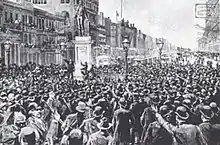 As thousands of demonstrators gathered near the Parish Prison, Pasquale Corte, the Italian consul in New Orleans, sought the help of Louisiana governor Francis T. Nicholls to prevent an outbreak of violence. The governor declined to take any action without a request from Mayor Shakspeare, who had gone out to breakfast and could not be reached.[39] Meanwhile, at the Clay statue, attorney William S. Parkerson was exhorting the people of New Orleans to "set aside the verdict of that infamous jury, every one of whom is a perjurer and a scoundrel."[40] When the speech was over, the multi-racial crowd [41][42][43] marched to the prison, chanting, "We want the Dagoes."[44]