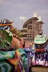 - Mystic Stripers Society: Two large 40-foot-long (12 m) emblem floats, one a ferocious and "strong" Tiger, another a sleek and "fast" Zebra.