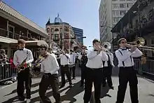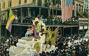 In 1830, a group of revelers, led by Michael Krafft, who was likely influenced by his Pennsylvania Swedish traditions of celebrating the New Year, stayed awake all New Year's Eve, started a dawn parade on January 1, 1831, making noise with cowbells, hoes, and rakes.[10][15] The group became the first parading mystic society, calling themselves the Cowbellion de Rakin Society, in a parody of French. They had annual parades each New Year's Eve.[2][10] Nearly 125 years after Mobile's first parade of 1711, members of the Cowbellion de Rakin Society, took their parade tradition to New Orleans in 1835, eventually forming the Mistick Krewe of Comus.[10]