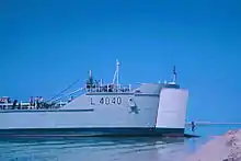 The vessels were 225 feet (69 m) long between perpendiculars and 231.2 feet (70.5 m) long overall, with a beam of 38 feet (12 m).[6] Although retaining the open tank deck of previous LCT designs, the Mark 8 was protected by a taller bow section, which was fitted with powered doors and ramp.[4] The capacity was eight 30-ton tanks, up to 13 fully loaded 3-ton trucks, or 350 tons of cargo.[3][7] Maximum displacement and draught varied depending on the loadout: trucks would result in a 650-ton displacement, 3-foot (0.91 m) draught at the bow, and 4-foot-8-inch (1.42 m) draught at the stern; for tanks, it was 780 tons, 3 feet 9 inches (1.14 m) forward, and 5 feet (1.5 m) aft; while a full load of cargo resulted in a displacement of 880 tons, and draughts of 4 feet 8 inches (1.42 m) and 5 feet 2 inches (1.57 m).[3] Maximum displacement was 1,017 tons.[6] The deeper draughts compared to previous vessels helped improve seakeeping.[2]