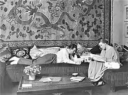 Shooting of the film was a draining experience for the actors involved due to the demands that Lang placed on them. For the scene where the worker's city was flooded, Helm and 500 children from the poorest districts of Berlin had to work for 14 days in a pool of water that Lang intentionally kept at a low temperature.[28] Lang would frequently demand numerous re-takes, and took two days to shoot a simple scene where Freder collapses at Maria's feet; by the time Lang was satisfied with the footage he had shot, actor Gustav Fröhlich found he could barely stand.[28] Other anecdotes involve Lang's insistence on using real fire for the climactic scene where the false Maria is burnt at the stake (which resulted in Helm's dress catching fire), and his ordering extras to throw themselves towards powerful jets of water when filming the flooding of the worker's city.[28][29]