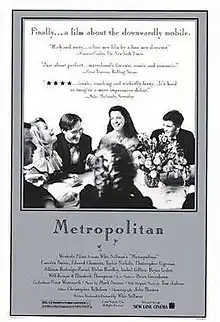 Metropolitan is a 1990 American romantic comedy-drama film and the debut of director and screenwriter Whit Stillman.[4] The film concerns the lives of a group of wealthy young socialites during debutante season in Manhattan. In addition to some of their debutante parties, it covers their frequent informal after-hours gatherings at a friend's Upper East Side apartment, where they discuss life, philosophy and their fate; form attachments, romances and intrigues; and react to an interesting but less well-to-do newcomer. Metropolitan was nominated for Best Original Screenplay at the 63rd Academy Awards.[5] The film is often considered the first of a trilogy of Stillman films, followed by Barcelona (1994, but written before Metropolitan) and The Last Days of Disco (1998).[6]