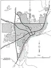 During the 1960s and 1970s, various freeway projects in the Detroit area were cancelled or scaled back in scope. The route of I-96 along Grand River Avenue was cancelled in response to freeway revolts in the city, and a new routing along the C&O Railroad right-of-way in Livonia was used instead.[94] Plans to transfer the Davison Freeway in the 1970s to state control and extend it west to I-96 (Jeffries Freeway) and east to a Van Dyke Freeway (extended M-53) were dropped.[72] Another freeway project near Lansing, the Van Atta Connector, was proposed in 1961 to provide an eastern freeway beltway around East Lansing,[95] but by 1981 the highway's impact to neighboring elementary schools along with larger economic impacts led to the project's cancellation.[96]