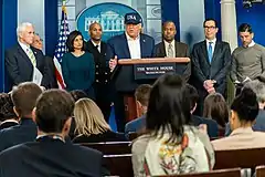 On 2 March, Trump told the media he had heard that a COVID-19 vaccine would be available in "a matter of months", with "a year [being] an outside number", after Trump attended a discussion where his senior health official Anthony Fauci told him this process would take "a year to a year and a half" (at a minimum, Fauci later said). During that discussion, Trump repeatedly quizzed the leaders of pharmaceutical companies on the time needed to produce vaccines, stating "I like the sound of a couple of months better".[26] The length of time is due in part to regulations and safeguards intended to guarantee efficacy and safety.[27] On 4 March, Trump blamed the Barack Obama administration for making "a decision" that delayed COVID-19 testing by the Trump administration. The policy in question had never been modified by the Obama administration, despite plans to do so. The policy's overall legal roots date to 2004, before the Obama administration. Under the umbrella of Emergency Use Authorizations, the old policy stated that laboratory-developed tests "should not be used for clinical diagnoses without FDA's approval, clearance, or authorization during an emergency declaration". However, this policy was historically treated as a recommendation and generally unenforced, with no clear legal authority of the FDA in this area. The Trump administration continued to require laboratories to apply to the FDA for approval, but allowed the laboratories to test while the FDA processed the applications.[28]