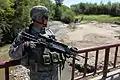 U.S. Army Cpl. Michael Tacker, from Tonasket, Washington, an infantryman assigned to the Kapisa-Parwan Provincial Reconstruction Team, leans against the guard rails of a bridge while providing security in Mahmood Rahqi, Afghanistan, Sept. 9. 2009