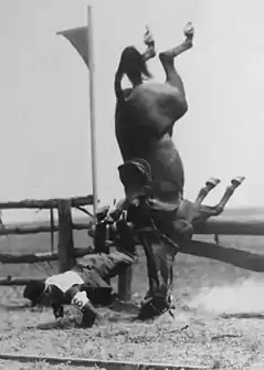Imre Petneházy crashing in the riding event. Neither the rider nor the horse were injured; Petneházy remounted and finished the race.
