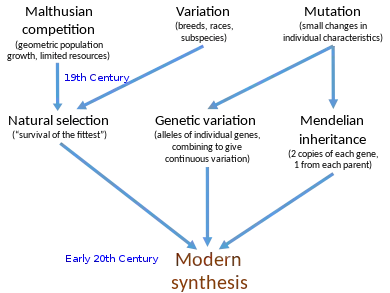 The modern synthesis[lower-alpha 1] was the early 20th-century synthesis reconciling Charles Darwin's theory of evolution and Gregor Mendel's ideas on heredity in a joint mathematical framework. Julian Huxley coined the term in his 1942 book, Evolution: The Modern Synthesis.