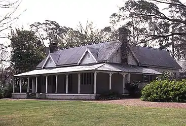 The Mount Wilson area was surveyed in 1868 by Edward Wyndham. It was subsequently named after Bowie Wilson, the then Secretary for Lands in the Government of New South Wales.[4] The new township became popular as a summer retreat for the wealthy in the latter part of the 19th century. Extensive gardens were planted around the houses there, taking advantage of the volcanic soils. Historical features that can still be seen include St George's Church, which was built by the children of Henry Marcus Clark and consecrated in 1916; and the house Withycombe, in The Avenue, which was built by George Henry Cox, a grandson of William Cox, who built the first road over the Blue Mountains.[5]