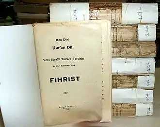 - Hak Dīni Kur'an Dili (1935) (A Qur'anic exegesis and translation in Turkish ordered by Mustafa Kemal)