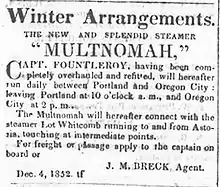 In the fall of 1852, Multnomah ran on the route from Portland up the Columbia River to the Cascades of the Columbia, under the command of Captain Fauntleroy.[3] In 1853, Multnomah was returned to the Portland-Oregon City route under Capt Richard Hoyt, Sr.[3] In late 1852, Multnomah, advertised as the "new and splendid steamer", made connections in Portland with the Lot Whitcomb, with Multnomah carrying traffic between Portland and Oregon City, and Lot Whitcomb running between Portland and Astoria.[9] Multnomah was advertised as embarking Oregon City passengers bound for the Whitcomb at 3:00 p.m. on Mondays and 7:30 a.m. on Wednesdays.[10] George Abernethy was Multnomah 's agent in Oregon City. Fares could be paid to Abernathy at his store or to the captain on board Multnomah.[10]