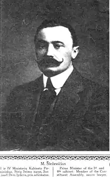Mykolas Sleževičius (21 February 1882 – 11 November 1939) was a Lithuanian lawyer, political and cultural figure, and journalist. One of the most influential figures in inter-war Lithuania, he served as the prime minister of Lithuania on three occasions. Taking the helm of the government at a difficult time in 1918 and again in 1919, Sleževičius has been credited with preparing Lithuania for the fights to come and for laying the foundations of the fledgling state.