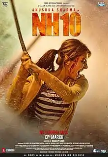NH10 was filmed over the course of 44 days.[7] On one occasion, around 2,000 people had gathered at a filming location on the outskirts of Gurgaon; Singh said the crowd had gathered out of curiosity but turned hostile after they were told to stay away from the set. Some people in the crowd started performing bicycle stunts and firing bullets.[23][24] The shoot was eventually cancelled.[25] Sharma said this incident "instilled some fear and anxiety" into her, which she channelled into the film.[12] NH10 was jointly produced by Phantom Films, Eros International and Clean Slate Filmz and was distributed by Eros International.[26][27] Sharma did not take a fee for the film; she "instead put it into the film".[28] The film's director of photography was Arbind Kannabiran, while Jabeen Merchant served as the editor.[29] The prosthetics in the film were made by French makeup artist Romy Angevin.[30]