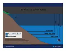 The National Geodetic Vertical Datum of 1929 is the official name since 1973[1] of the vertical datum established for vertical control surveying in the United States of America by the General Adjustment of 1929. Originally known as Sea Level Datum of 1929, NGVD 29 was determined and published by the National Geodetic Survey and used to measure the elevation of a point above and depression below mean sea level (MSL).
