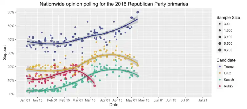 | ABC News/Washington Post[57] | 400 | ± 5.5% | March 3–6, 2016 | 25% | 13% | 18% | 34% | None 5% Other 4% |
