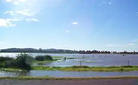 Nelsons Plains is a wedge-shaped suburb, bisected by Seaham Road, with the point of the wedge in the south-eastern corner where the Williams River joins the Hunter River.[6] This part of the suburb is generally less than 2 metres (7 ft) above river level, making it subject to periodic flooding, as happened during the June 2007 Hunter Region and Central Coast storms. In the north-eastern corner of the suburb elevations reach up to 42 m (138 ft) but to the east of Seaham Road, between the road and the Williams River, the ground slopes quickly downward to a height of less than 2 m (7 ft) above river level, making this part of the suburb also subject to flooding.