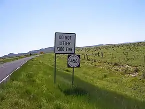 NM 456 parallels the Cimarron River for its entire length. It does not leave Union County. It is a former routing of U.S. Route 64 (US 64). Seventeen consecutive miles of it are unpaved, as per signs at each end of the unpaved stretch; their main purpose is to warn of potential impassibility in inclement weather. The stretch does have two spots of pavement, nevertheless: one about eight miles (13 km) in from the west, which is only about 100 feet (30 m) long, and one about fourteen miles (23 km) in from the west, which often confuses drivers since it is so near to the end of the advertised length (its pavement lasts about 0.5 miles (0.80 km)). The drive has some nice scenic views, including one reminiscent of Colorado's Garden of the Gods; but its remoteness is not amicable to tourists having automobile breakdowns.