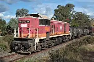 In June 1994, the Manildra Group leased 4907 from FreightCorp for use at its Gunnedah mill.[6] Later in 1994, Manildra purchased 4907 along with 4913 and had them rebuilt by Clyde Engineering, Kelso with lower No.1 ends, the second being for use at their Manildra mill.[7][8] To haul infrastructure trains in Victoria during the Melbourne-Adelaide railway standard gauge conversion project, 4903, 4912 and 4916 were leased to National Rail in late 1994.[9]