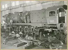 In 1943, approval was given for the New South Wales Government Railways Workshops to build 25 freight locomotives. The design was a modified version of the 57 class. The main alterations were the use of a rack and pinion valve gear[1] in lieu of the Gresley 2:1 conjugated valve gear for the middle cylinder and the use of smaller cylinders to enable the locomotives to run to on the Main North line to Broadmeadow, a route which had a tighter loading gauge. They also used a Woodard divided drive of twin coupling rods between the second and third driving wheels. A valance was fitted over the valve gear on the front platform.[2] Similarly to the earlier D57 class and the later AD60 class, the 58 class were fitted with a mechanical stoker to feed the large firebox