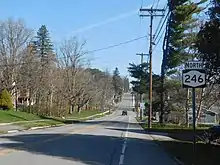 The north–south highway connecting the village of Perry to Perry Center was taken over by the state of New York by 1926[4] and designated as part of NY 245 in the 1930 renumbering of state highways in New York. At the same time, NY 246 was assigned to a proposed highway connecting NY 245 in the village of Perry to NY 36 north of the village of Mount Morris.[2][5] When construction on the highway began c. 1933, the road was reconfigured on its northeastern end to merge with US 20 (now US 20A) southwest of Leicester instead.[6][7] The highway, now part of NY 39, was completed by the following year; however, it opened as part of a realigned NY 245 while NY 246 was reassigned to NY 245's former routing along the Perry–Perry Center highway.[8] NY 246 was extended north to NY 63 in Pavilion in the early 1950s.[9][10]