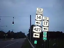 In the months immediately following the 1930 renumbering, NY 14 was routed on Pennsylvania Avenue and South Main Street through southern Elmira.[6] By 1935, NY 14 was rerouted to follow Pennsylvania Avenue into downtown. As a result, all of NY 17D north of the junction of Pennsylvania and Maple avenues became concurrent with NY 14.[7][8] The overlap was eliminated in the early 1940s when NY 17D was pulled back to the intersection of Pennsylvania and Maple avenues and renumbered as NY 427.[2][3]