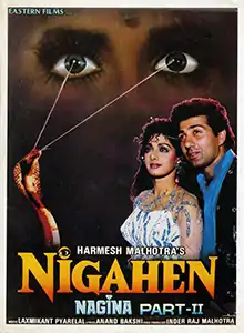 Nigahen: Nagina Part II is an Indian fantasy film directed by Harmesh Malhotra, released in 1989. The movie stars Sridevi, Sunny Deol, Anupam Kher, and Gulshan Grover. It is the sequel to the Sridevi-lead blockbuster Nagina.[1][2] However, the movie performed poorly and bombed at the box office.