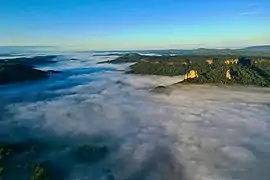 - Nimbin Rocks, a series of jagged outcrops, solidified plugs left after the erosion of volcanic dykes and vents, and Blue Knob, which are both landmarks for the village.