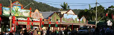 Forests of red cedar first attracted loggers to the area in the 1840s, but by the end of the century, most of the land had been cleared. With the cedar forests gone, Nimbin was subdivided in 1903, with the land turned over to dairy farming and growing bananas.[5] In the 1960s, the local dairy industry collapsed due to recession and Nimbin went into serious economic decline until 1973, when the Aquarius Festival, a large gathering of university students, practitioners of alternative lifestyles, hippies, and party people, was held in the village.[6] The festival was the first event in Australia that sought permission for the use of land from the Traditional Owners and made a significant attempt at reconciliation.[7] After the festival, hundreds of participants and festivalgoers remained in Nimbin to form communes and other multiple-occupancy communities, in search of an "alternative lifestyle". Nimbin in fact made legal history for the first ever application of group title ownership of land in Australia. Since the Aquarius Festival, the region has attracted thousands of writers, artists, musicians, actors, environmentalists, and permaculture enthusiasts, as well as tourists and young families escaping city life.[3]