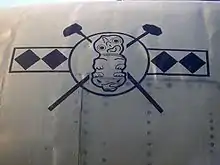 | Squadron Badge | Tiki in front of two crossed mining hammers in saltire |