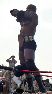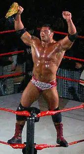 The next match was a Cruiserweight Open for the WWE Cruiserweight Championship.[21][24] The match began with Scotty 2 Hotty against Daivari; Hotty eliminated Daivari via pinfall after performing the Worm.[6] The Cruiserweight Champion, Gregory Helms, then entered the match and eliminated Hotty via pinfall after he performed a Double knee facebreaker on Hotty.[23] Funaki was the next participant to enter the match; however, he was eliminated via pinfall after Helms executed a Crossbody into a pin while holding onto Funaki's tights.[5] Shannon Moore was the fifth entrant into the gauntlet, but was eliminated via pinfall after Helms performed a Double knee facebreaker on him.[6] Jimmy Wang Yang, the sixth entrant, eliminated Helms via pinfall after performing a Hurricanrana pin.[5] Jamie Noble was the seventh entrant into the Gauntlet match, but he was eliminated via pinfall after Yang performed a moonsault into a pin.[22] The final entrant, Chavo Guerrero, pinned Yang after a frog splash, thus winning the title.[5][21][24]