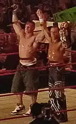 The secondary feud heading into No Way Out was between Chris Benoit and The Hardys against MNM and Montel Vontavious Porter (MVP). This feud began shortly after MNM reformed, when they challenged the reunited Hardys at December to Dismember in a losing effort.[14] They then continued to wrestle on episodes of Raw, ECW, and SmackDown! until Armageddon, when Mercury suffered a legitimate severe facial injury.[15] On the February 16 episode of SmackDown!, SmackDown General Manager Theodore Long announced a ladder match between Paul London and Brian Kendrick, Dave Taylor and William Regal, MNM, and The Hardys for the WWE Tag Team Championship (the same match all four teams had against each other at Armageddon), but WWE's official website announced the match had changed to pit The Hardys and Chris Benoit against MNM and MVP, while Brian Kendrick and Paul London faced Deuce 'n Domino in a separate match.[16][17][18] Benoit and MVP were added to the match on short notice, as they were not feuding at the time.[18][19]