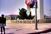 The 1992 Los Angeles riots, sometimes termed the "Los Angeles uprising", are remembered for the use of the slogan,[6] which expressed collective frustration with the existing social and economic order.[7]