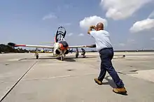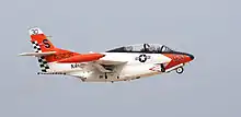 Every jet-qualified Naval Aviator and virtually every Naval Flight Officer from the late 1950s until 2004 received training in the T-2 Buckeye, a length of service spanning four decades. The aircraft first exited the Naval Aviator strike pipeline (where it saw its final carrier landings) in 2004,[8] and the Naval Flight Officer tactical jet pipeline in 2008. In the Naval Aviator strike pipeline syllabus and the Naval Flight Officer strike and strike fighter pipeline syllabi, the T-2 has been replaced by the near-sonic McDonnell Douglas T-45 Goshawk (the U.S. Navy version of the BAE Systems Hawk), which is more comparable to other high-performance, subsonic trainers, or the supersonic U.S. Air Force Northrop T-38 Talon.[9] More recently, the T-2 has been used as a director aircraft for aerial drones. Several T-2 Buckeyes, although still retaining their USN markings, are now registered as civilian-owned aircraft with FAA "N" numbers; they regularly appear at airshows.