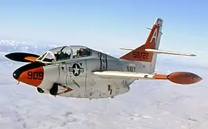 In 1956, the US Navy issued a requirement for a jet-powered basic trainer to replace its T-28 piston-engined aircraft. (Primary training for the US Navy remained the responsibility of the piston-engined Beechcraft T-34 Mentor while the jet-powered Lockheed T2V SeaStar provided more advanced training). North American Aviation won the US Navy's competition for the new training aircraft in mid-1956 with its NA-241 design.[3] North American's design, designated the T2J-1 by the US Navy, was a mid-winged monoplane with trainee and instructor sitting in tandem on North American-built ejection seats, with the rear (instructor's) seat raised to give a good view over the trainee's head. The aircraft's unswept wing's structure was based on that of the FJ-1 Fury, while its control system was based on the T-28C.[4] It was powered by a single Westinghouse J34-WE-46/48 turbojet, rated at 3,400 lbf (15 kN).[5] While it had no built-in armament, the T2J-1 could accommodate two .50-inch gun pods, 100 lb (45 kg) practice bombs, or 2.75-inch rockets beneath the wings.[4] The T-2's performance was between that of the U.S. Air Force's Cessna T-37 Tweet and the U.S. Navy's TA-4J Skyhawk.