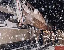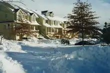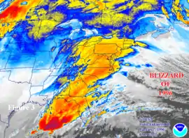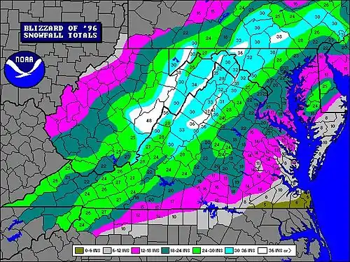 The Blizzard of 1996 was a severe nor'easter that paralyzed the United States East Coast with up to 4 feet (1.2 m) of wind-driven snow from January 6 to January 8, 1996. This storm was a classic example of a nor'easter, but the storm would not have been as historically significant without the presence of the arctic high pressure system located to the north of New York.[2] It was followed by another storm, an Alberta Clipper, on January 12,[3] then unusually warm weather and torrential rain which caused rapid melting and river flooding. Along with the March Superstorm of 1993 and the January 2016 United States blizzard, it is one of only three snowstorms to receive the top rating of 5, or "Extreme", on the Northeast Snowfall Impact Scale (NESIS).[4]