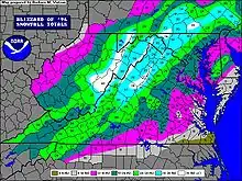 Most of Virginia was impacted with the more central and western parts receiving one to three feet (30 to 91 cm) of snow.[5] Roanoke got a record-breaking 23 inches (58 cm). The heaviest snow fell in Page County, with around 37 inches (94 cm). Snowfall reached three feet (91 cm) in the Shenandoah Valley and exceeded two feet (61 cm) in much of the Virginia mountain and Piedmont areas. Gov. George Allen declared a state of emergency as power lines went down, people were trapped in their houses, and at least eight weather-related deaths occurred. High winds that accompanied the blizzard caused white out conditions and drifts of up to 10 feet (300 cm) in Patrick County.