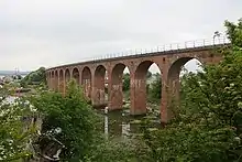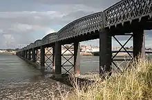 Two viaducts south of Montrose were designed by Sir Thomas Bouch, the architect of the original Tay Bridge, but due to delays in building the Tay Bridge and the line by Dundee, they were not built until 1879.[11] Construction was by Gilkes Wilson and Company supervised by Bouch's son William.[12] The more northerly bridge the South Esk Viaduct, was of iron lattice girder construction.[13][note 4] Following the Tay Bridge disaster of 1879 the viaduct was inspected and found to have a distinct curve, although the plans showed a straight bridge, and many of the piers were out of perpendicular.[11] Tests in 1880 over a period of 36 hours using both dead and rolling loads led to the structure becoming seriously distorted and eight of the piers were declared unsafe.[11][13] It had to be dismantled and rebuilt by Sir William Arrol to a design by W. R. Galbraith before the line could be opened to traffic in 1881.[11][14][15] The replacement was also of wrought iron lattice girder construction based on designs dating back to the 1830s.[11] Such designs were widely used by Victorian engineers until rendered obsolete by the introduction of other American truss designs in the 1880s.[11] South Esk Viaduct at Montrose was probably the last major bridge in the United Kingdom to be built with this type of bracing.[16] The more southerly brick viaduct, the Ferryden Viaduct, was retained.[11]