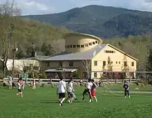 The Main Building built in 1938 and expanded in 1946 owes its design to Douglas Haskell and Henry Churchill.[5] It houses classrooms, a computer lab, dining room, Quonset gymnasium, art studios, dark room, music practice rooms, and administrative offices. Students live in family-style houses (opposed to dormitories). The campus has undergone recent upgrades including the construction of a Timber frame art and dance performance pavilion (2002), the construction of student residence Clark House (2010),[6] the addition of a high-efficiency biomass heating plant (2013),[7] and an award-winning renovation of an 1880s barn (2013).