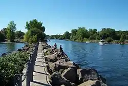 The state fish hatcheries release brown trout, salmon and steelhead each year into the river. Fishing may be done from boats in the lower part, by wading in the upper parts, and from the shore along its length.