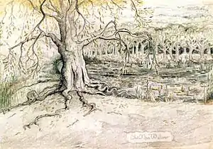 Old Man Willow is a malign tree-spirit of great age in Tom Bombadil's Old Forest, appearing physically as a large willow tree beside the River Withywindle, but spreading his influence throughout the forest.[T 1][5][T 13] He casts a spell on the hobbits, trapping two of them; they are rescued by Tom Bombadil.[T 1] Bombadil explains that they tree was wholly evil, and had grown to control most of the Old Forest.[T 14] Tolkien made a drawing of Old Man Willow, from an unpollarded tree by the river in Oxford, to support his writing.[4] The evil tree has puzzled critics, as it does not fit with Tolkien's image as an environmentalist "tree-hugger"; others have noted that trees too are seen by Christians as affected by the Biblical Fall of Man.[5][6][7] [8]
