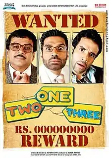 One Two Three is a 2008 Indian Hindi-language comedy film which is an uncredited remake of the 1992 American film Blame It on the Bellboy about three men with similar surnames staying in the same hotel. One Two Three stars Sunil Shetty, Paresh Rawal, Tushar Kapoor, Esha Deol, Sameera Reddy, Neetu Chandra, Upen Patel and Tanisha. It revolves around three men who share the same name — Laxmi Narayan. The film was rated a hit grosser by boxofficeindia.com.