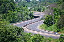 Within St. Catharines, Highway 406 twists frequently, entering the Twelve Mile Creek valley south of a complicated interchange with Westchester Avenue and Geneva Street and curving west. Within the valley, the freeway features a lower design speed and reduced speed limit of 80 km/h (50 mph).[9] It passes beneath the high-level St. Paul Street bridge, crosses the creek and intersects Fourth Avenue. Exiting the creek valley, the freeway parallels Fourth Avenue for a 1 kilometre (0.62 mi), gradually curves to the north and ends 3 km (1.9 mi) to the north, merging with the QEW.[5]