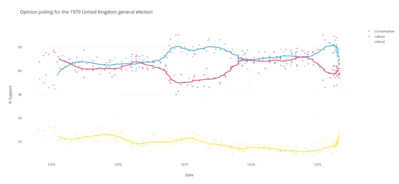 The chart below depicts opinion polls conducted for the 1979 United Kingdom general election using a 15-poll moving average.