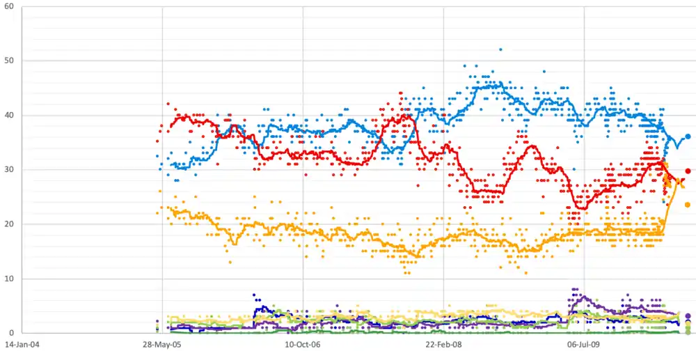 | 5 May | 2005 general election (GB figures)[16] | – | 36.2% | 33.2% | 22.7% | 7.9% | 3% |