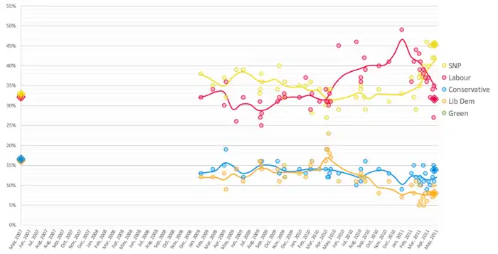 Average 30 day trend line of poll results for the 2016 Scottish Parliament election. Results from 30 January 2009 to 4 May 2011