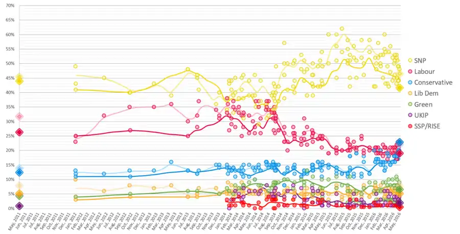 Average 30 day trend line of poll results for the 2016 Scottish Parliament election. Results from 29 January 2012 to 4 May 2016