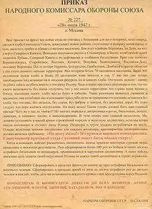 Order No. 227 (Russian: Приказ № 227, Prikaz No. 227) was an order issued on 28 July 1942 by Joseph Stalin, who was acting as the People's Commissar of Defence. It is known for its line "Not a step back!" (Russian: Ни шагу назад!, romanized: Ni shagu nazad!),[1] which became the primary slogan of the Soviet press in summer 1942.[2]